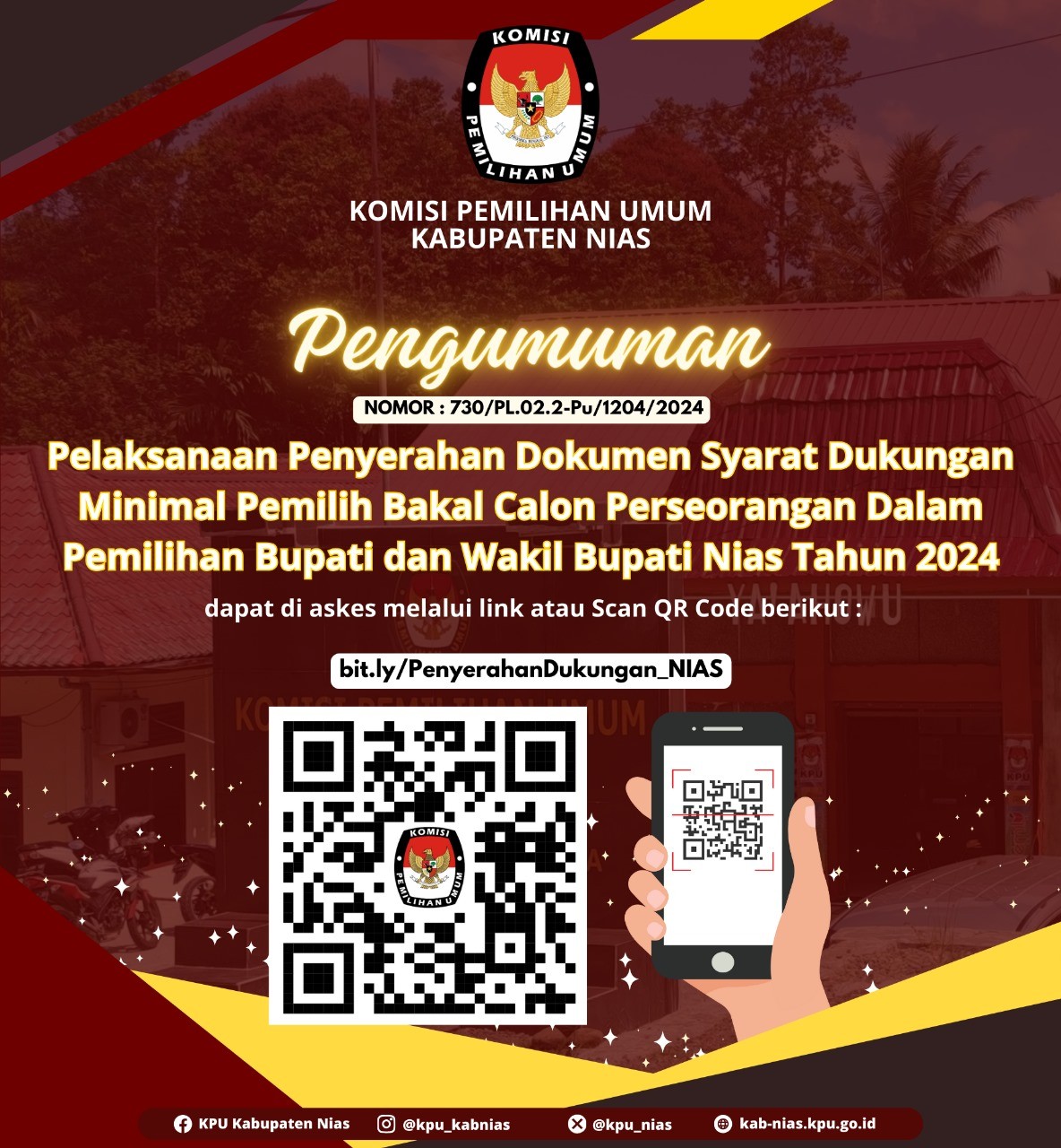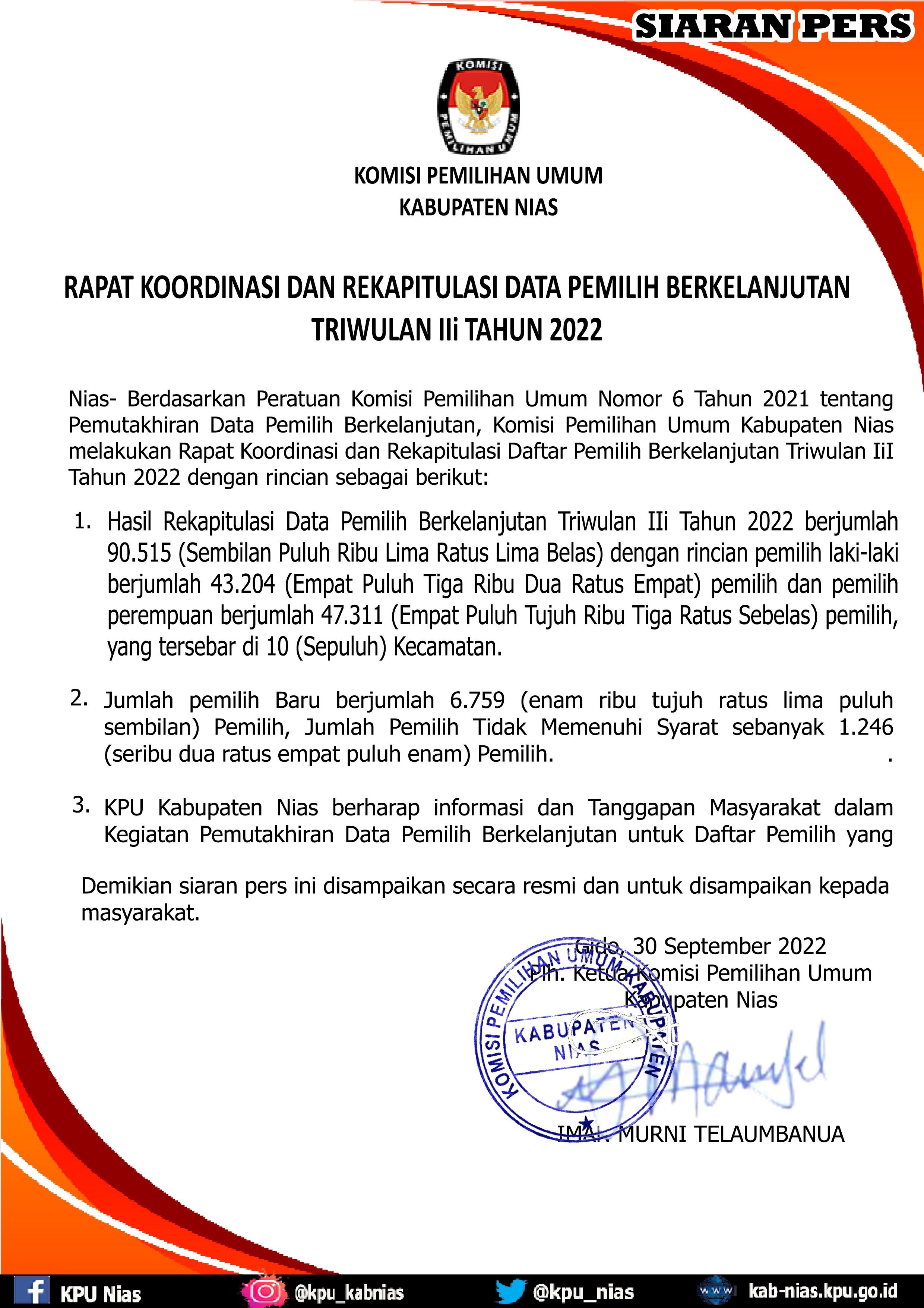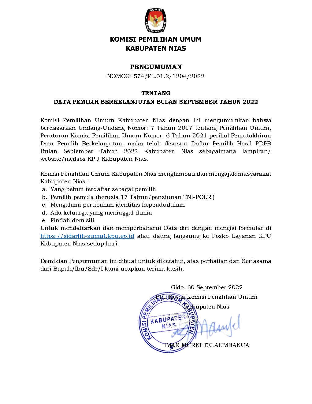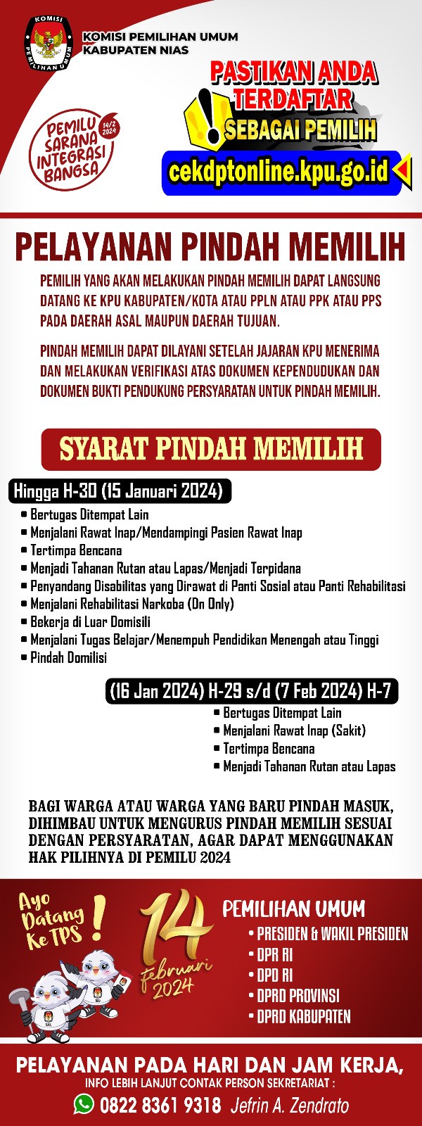 Bahwa untuk melaksanakan ketentuan Pasal 70 Peraturan KPU Nomor 10 Tahun 2023 tentang Pencalonan Anggota Dewan Perwakilan Rakyat, Dewan Perwakilan Rakyat Daerah Provinsi, dan Dewan Perwakilan Rakyat Daerah Kabupaten/Kota, KPU Kabupaten Nias Mengumumkan Daftar Calon Sementara (DCS) Anggota DPRD Kabupaten Nias dan Persentase Keterwakilan Perempuan dalam Daftar Calon Sementara (DCS) pada Pemilu Tahun 2024, info selengkapnya>>> KLIK DISINI <<<....