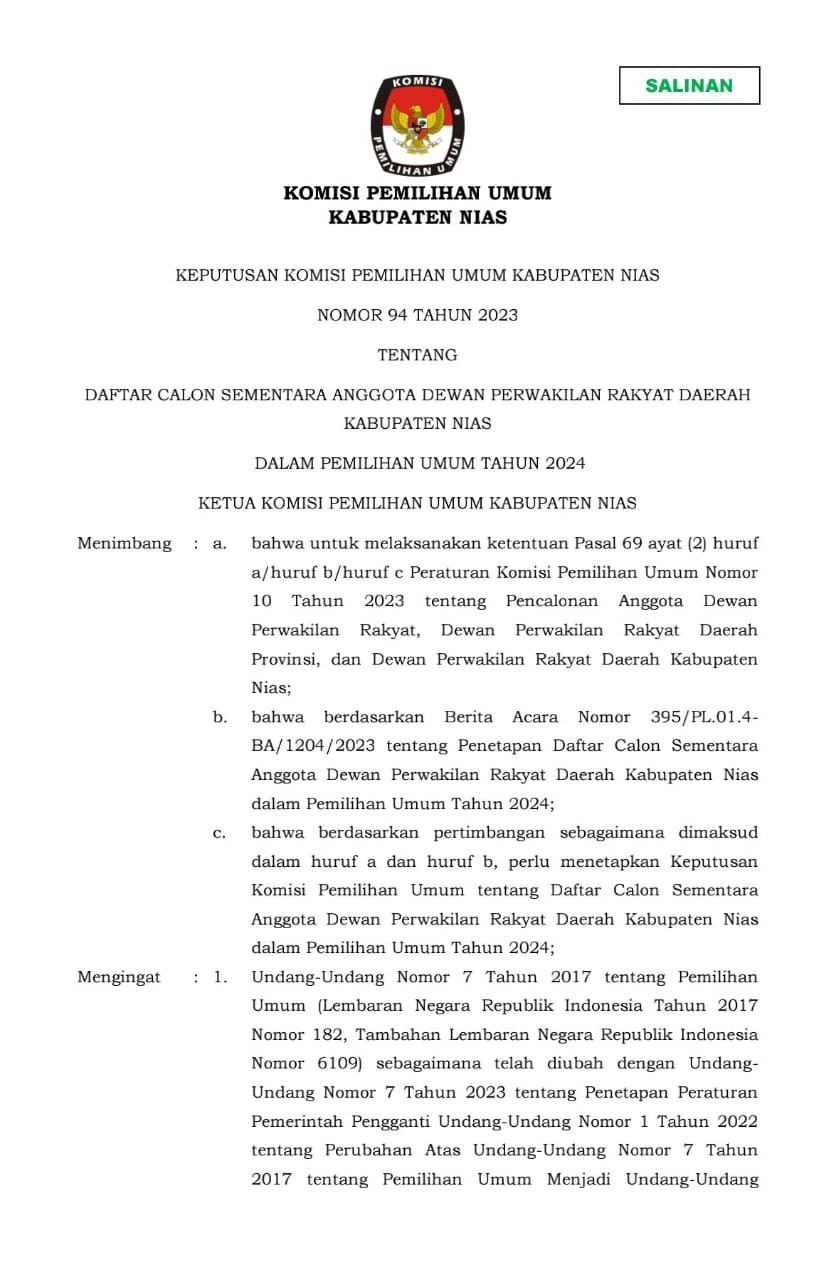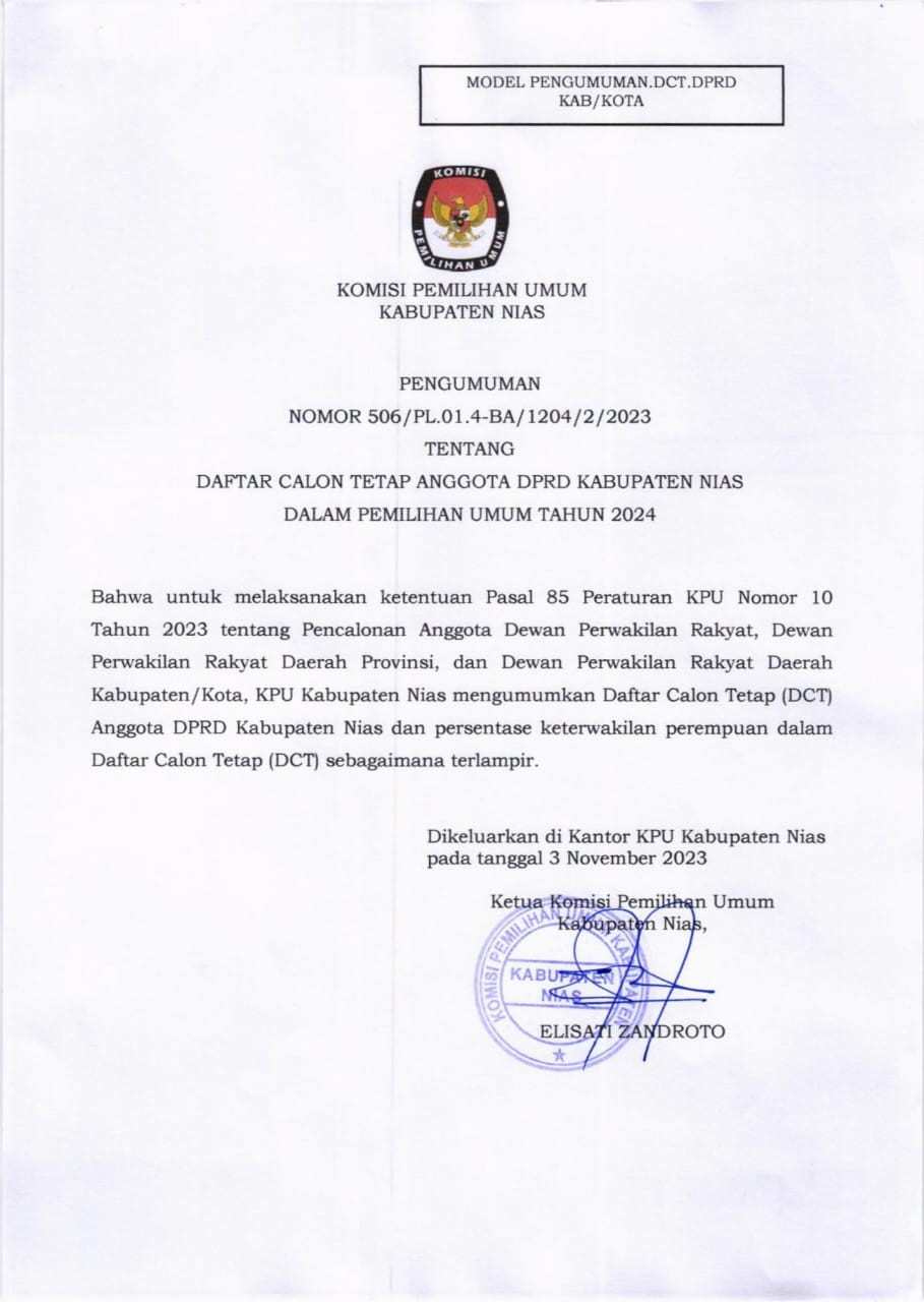 PENGUMUMAN DAFTAR CALON SEMENTARA (DCS) ANGGOTA DPRD KABUPATEN NIAS DALAM PEMILU TAHUN 2024
