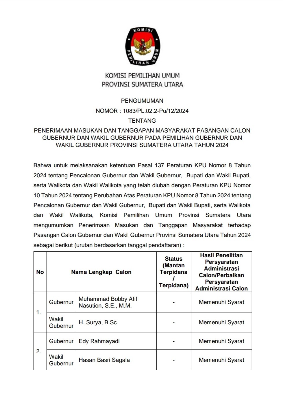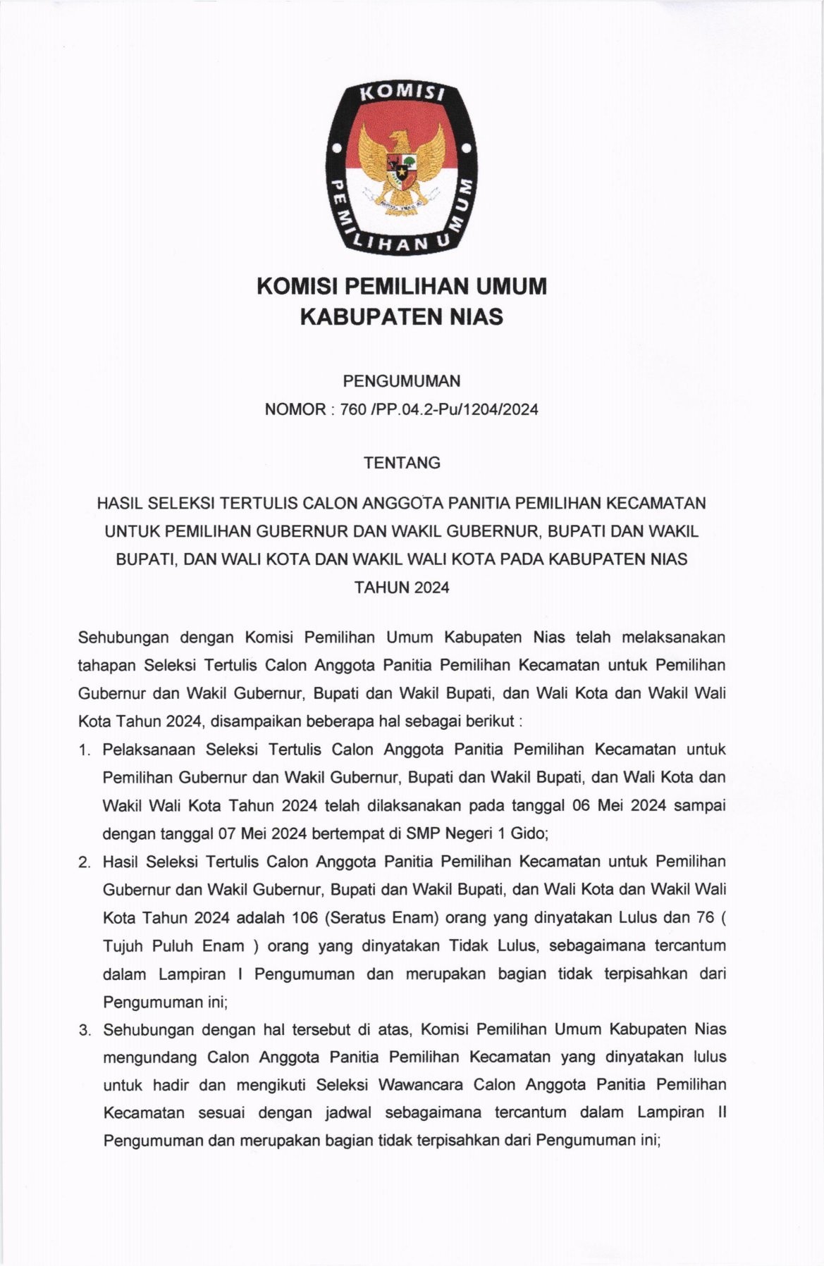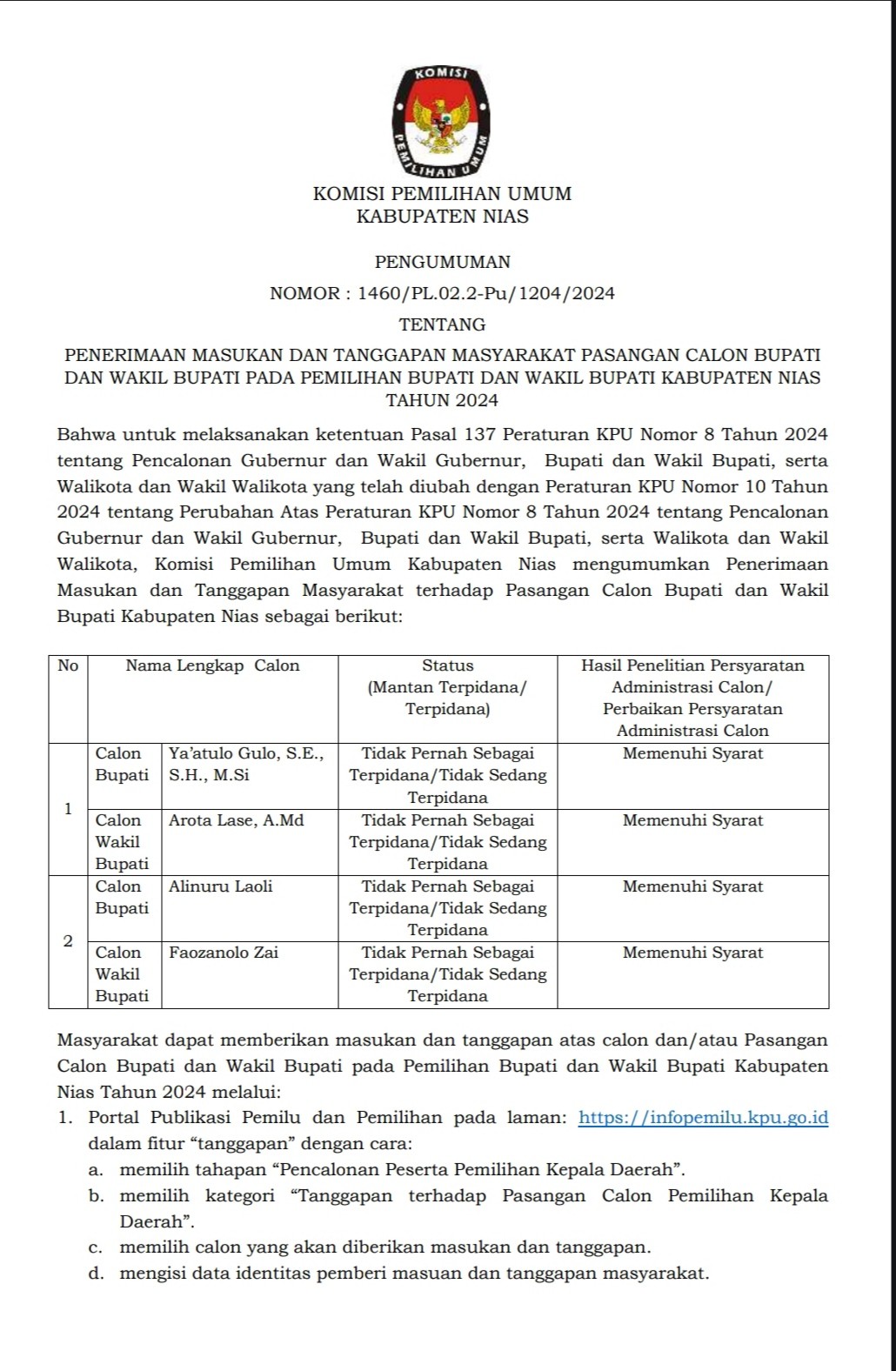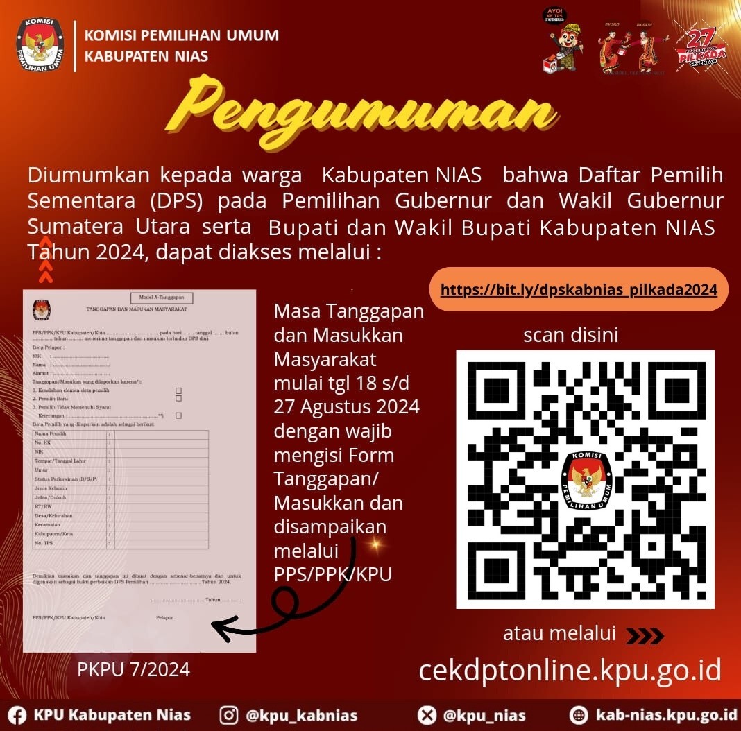 #TemanPemilih, Kpu Kabupaten Nias mengumumkan kepada warga masyarakat Kabupaten Nias bahwa Daftar Pemilih Sementara (DPS) pada Pemilihan Gubernur dan Wakil Gubernur Sumatera Utara serta Bupati dan Wakil Bupati Tahun 2024, dapat diakses melalui :